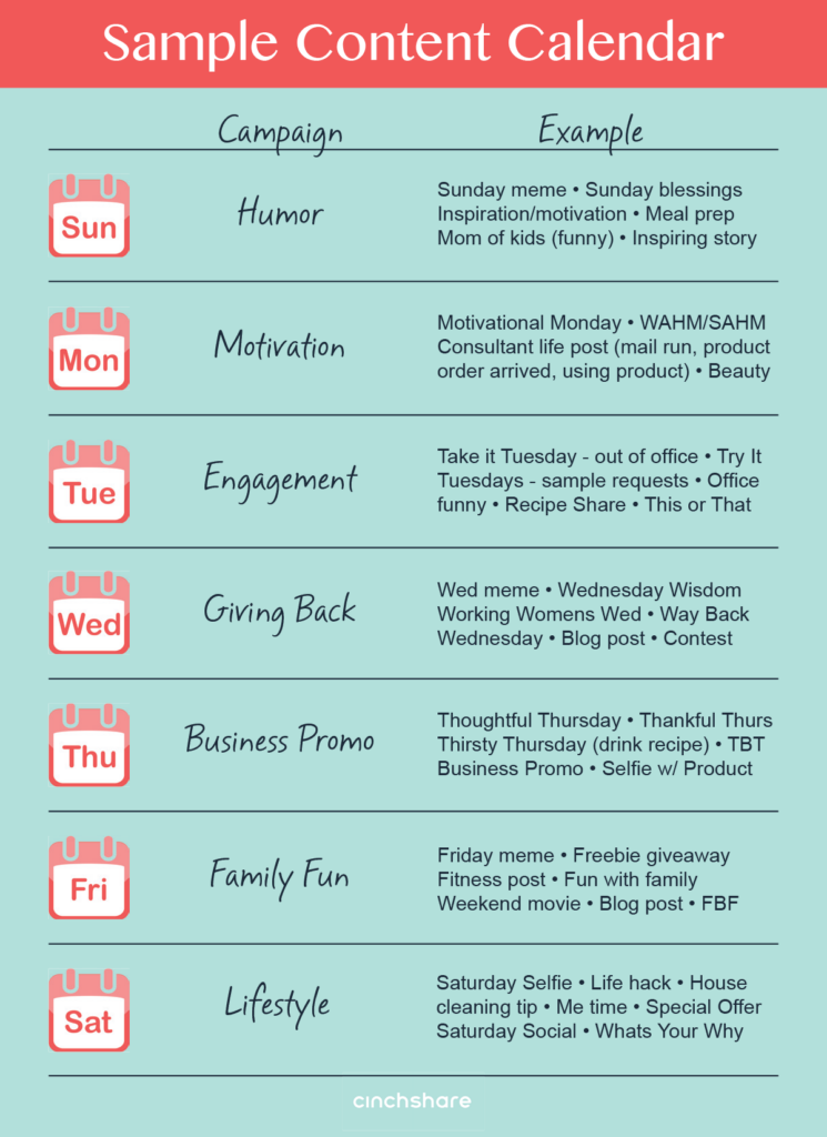 Trisha Lewis of Perfectly Posh, graciously shared her weekly calendar with us that she devised for her team. Use this as a guideline for your own calendar. See what resonates with you! Every company is different, but this is a great starting point for ideas. Trisha’s branded campaigns like “Masking Mondays, Try it Tuesdays, Posh on the Go, Facemask Fridays” really make it fun and interesting for her followers to see each week! What unique themes can you come up with for your business?